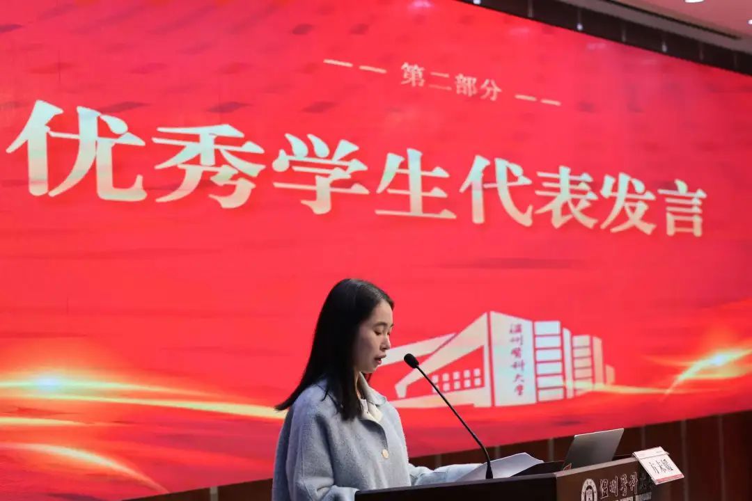在追寻梦想途中既需要自己的努力,也需要榜样的指引。来自2021级康复2班方未媛作为优秀员工代表发言。她从员工工作、学业科研、志愿实践三个方面为同学们讲述了自身的经历和成长。鼓励同学们打好学业基础的同时也要积极参与各类大赛和志愿服务活动,锻炼个人能力,增长自身见识。