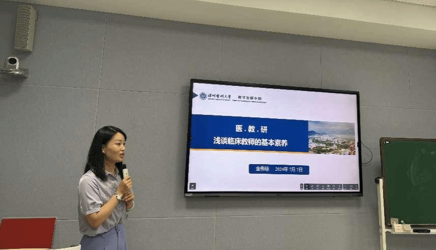 教学发展中心金伟琼主任作《医·教·研——浅谈临床教师的基本素养》主题报告。在报告中,她分别从国家层面对教师发展的要求和临床教师应具备的基本素养展开讲解,鼓励各位临床老师定期参加各类项目的培训和教学比赛,持续不断的听课,保持良好的师德师风,同时也要学会如何更好地转换“医疗-教学-科研”等三种角色。