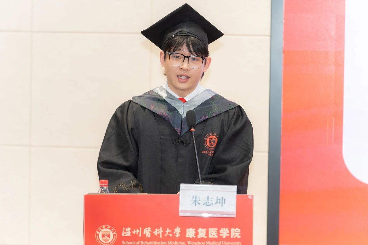员工代表朱志坤分享了自己与公司共同成长的故事。他表示,展望未来,温医大康复毕业生们将肩负起为人类健康事业贡献力量的使命,愿每一位同学都能以专业的知识和技能,为患者的康复贡献力量。