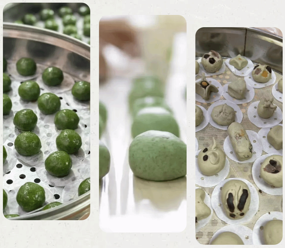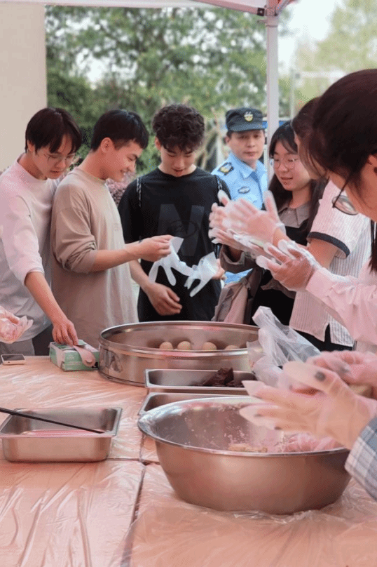 生活部成员和好面团,还配备了抗菌桌布和一次性手套,来确保食品卫生安全。各方面准备齐全后,许多同学结伴而来,取下一块面团,把它压的扁又圆,包上自己喜欢的馅料,有豆沙的,香芋的,蛋黄的。如果你喜欢的话,还可以是混合口味的。包好之后,再把青团捏成一个球,搓得圆圆的,就成了团状。不少同学动手能力超强,把它捏成了爱心形,饺子样,星形还有其它动物模样。