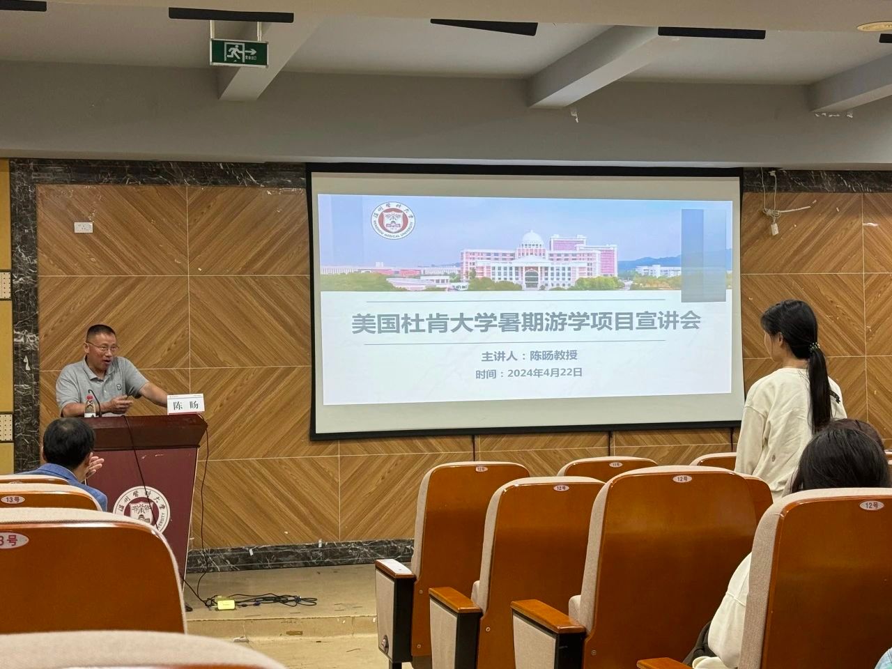 宣讲会中,陈旸教授首先介绍了美国杜肯大学的基本情况并就大家关心的课程、费用等方面进行了说明。陈教授还展示了往届学长学姐的游学经历,鼓励大家走出国门,亲身体验更大更广阔的天地,感受不同国家的风土人情。最后,陈教授耐心解答了同学们在游学申请和游员工活等方面的问题,为大家提供了宝贵的建议和指导。