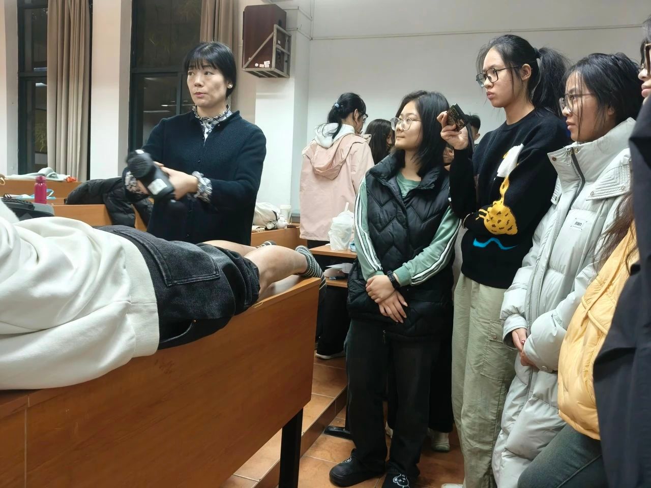 从肌贴的正确使用,到拉伸动作精准示范;从常见运动损伤预防,到紧急情况的处理,事无巨细地讲解。同学们互相充当“模拟选手”,纠正力度、角度偏差,只为上场时能胸有成竹。