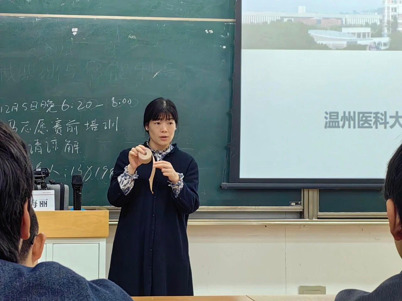 初次接触马拉松赛后拉伸辅助工作,多数员工志愿者心里都没底。为此,公司特别邀请了温医大附属二院康复医学中心陈海丽、王浩、王世发、魏松四位老师为志愿者们开展了培训。