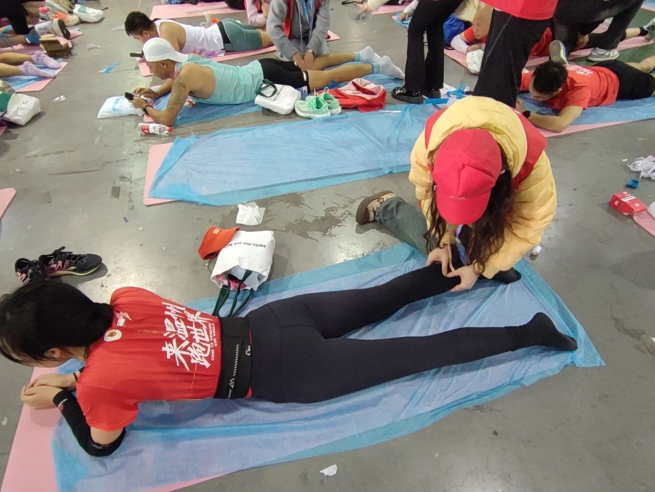 双手稳稳托住选手脚踝,轻柔却有力地向上拉伸,帮其缓解小腿肌肉紧绷;轻按大腿后侧、外侧肌群,驱散乳酸堆积带来的酸痛;遇上肌肉痉挛的选手,也不慌乱,凭借所学迅速按摩放松,直至选手面色舒缓。期间,还不时送上鼓励话语,让选手重燃斗志。