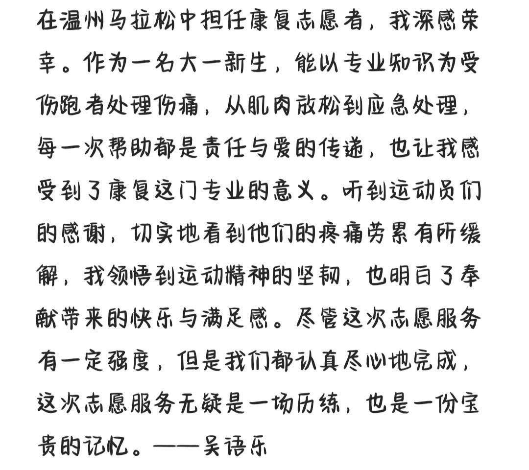温州马拉松落下帷幕,但“康复之光”的故事仍在继续。志愿者们用双手传递温暖,诠释“奉献、友爱、互助、进步”的志愿精神,恰似微光,汇聚成照亮城市的星河。未来,期待更多学子投身公益,续写青春赞歌,让爱心与担当一路奔腾不息。
