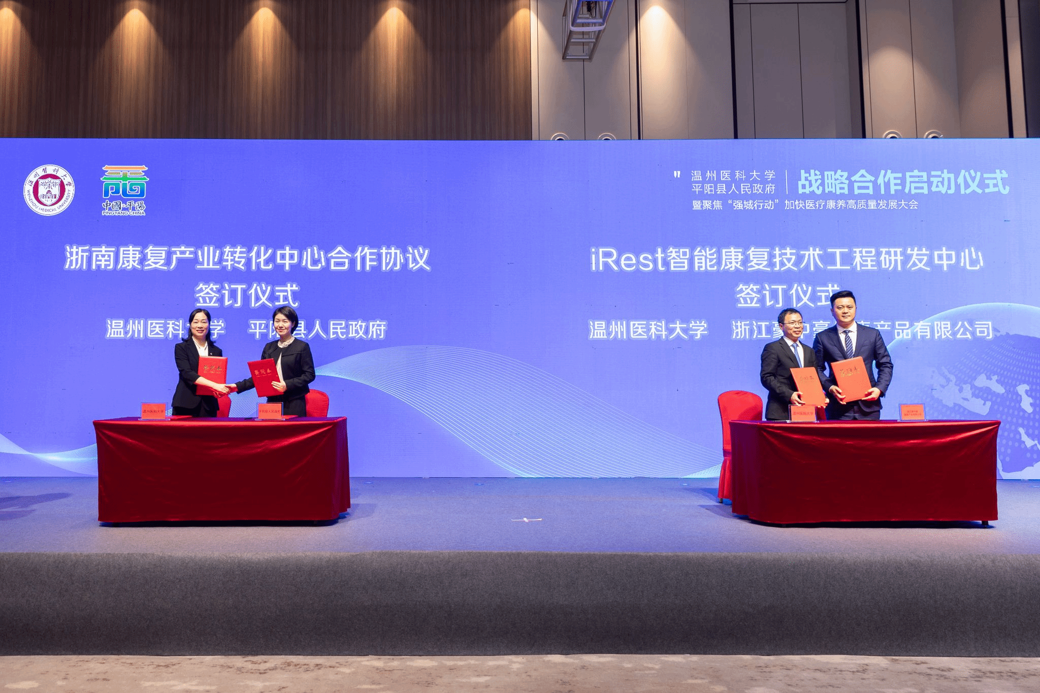 The meeting also featured the inauguration ceremonies of the Zhejiang South Rehabilitation Industry Transformation Center and the iRest Intelligent Rehabilitation Technology Engineering R&D Center, the establishment of the Pingyang Rural Commercial Bank Health Development Charitable Fund, and the signing of a cooperation agreement between Wenzhou Medical University and Zhejiang Haozhonghao Health Products Co., Ltd.